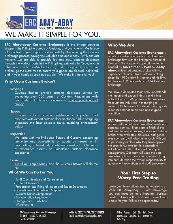 ERC Abay-abay Customs Brokerage is the bridge between shippers, the Philippine Bureau of Customs, and your clients. We let you take control of your imports and exports by streamlining the customs brokerage process, saving you valuable time and money. With our vast network, we are able to provide fast and easy customs clearance through the various ports in the Philippines, primarily in Cebu, and in other areas such as Manila, Davao, and Cagayan de Oro. Our brokers go the extra mile to ensure your goods are cleared, delivered, and in your hands as soon as possible. Leave your international trading worries to us. With ERC Abay-abay Customs Brokerage, you can focus on more important business needs. Let us do the work and make things simple for you.